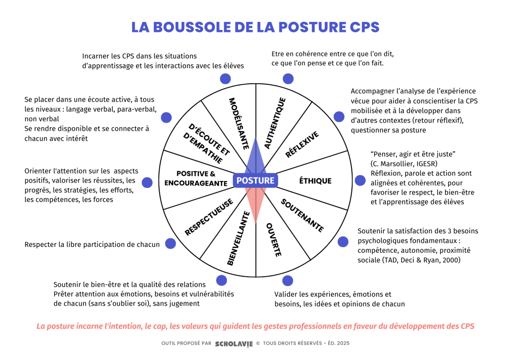 Découvrez une boussole qui indique les différentes composantes d’une posture favorable au développement des CPS des enfants et des jeunes. Retrouvez avec un document explicatif sur la posture et les gestes professionnels.