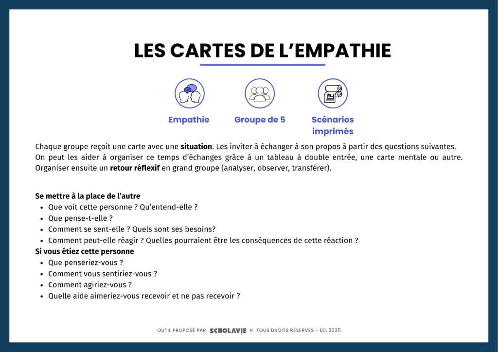 Découvrez des cartes présentant des scénarios à faire avec les jeunes, pour les aider à expérimenter l’empathie au quotidien.