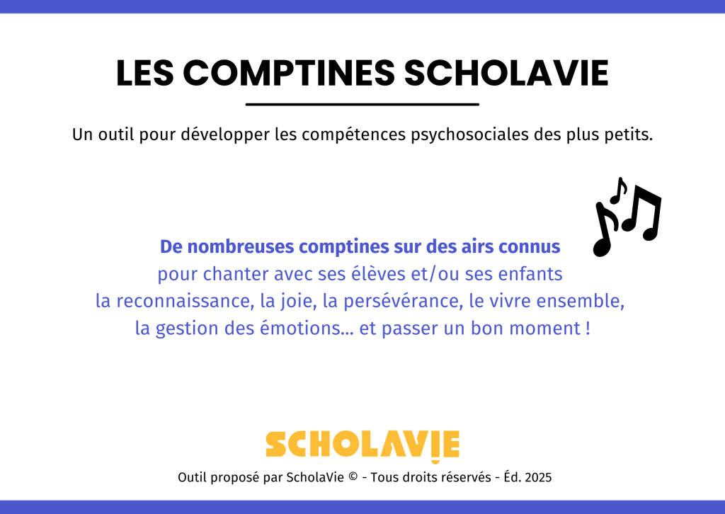 Des comptines sur des airs connus pour chanter avec les enfants la reconnaissance, la persévérance, le vivre ensemble, les émotions… et passer un bon moment !