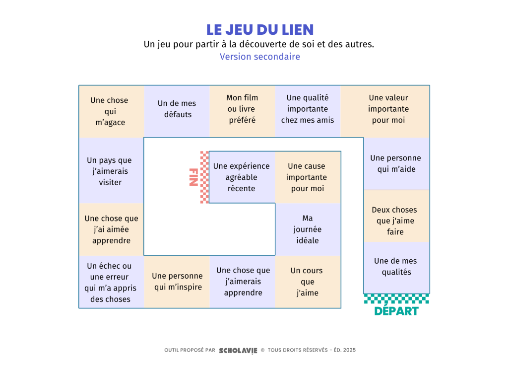 Avancez sur le plateau de jeu pour partir à la découverte des jeunes ou des collègues qui jouent avec vous, ou à la découverte de vous-même !